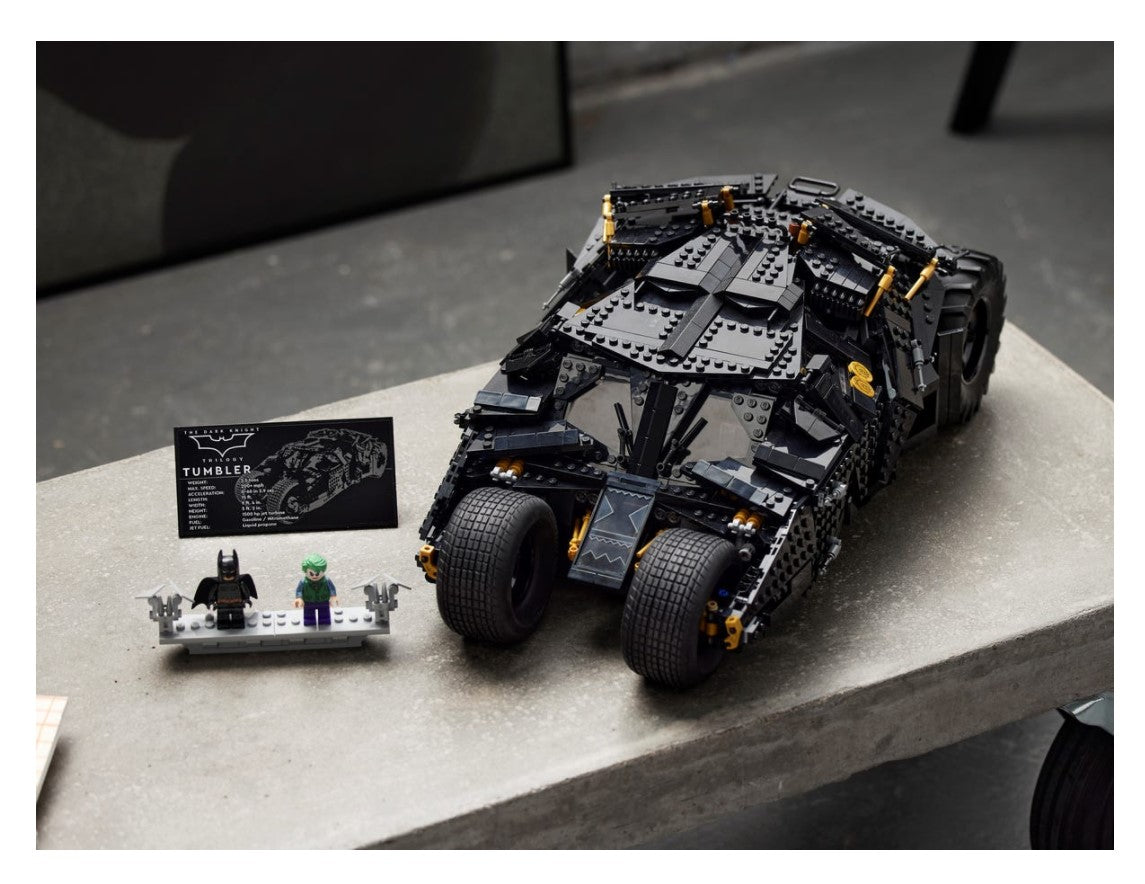 The ultimate armoured crime-fighting machine. The impressive build-and-display Tumbler from the Dark Knight™ trilogy of Batman movies features an opening roof, which provides access to the driver and passenger seats and control panel. Batman and The Joker™ minifigures are included with a stand. With a sturdy base to display the finished model at its best, your recreation of the Tumbler will provide pleasure long after the hands-on work has been completed.