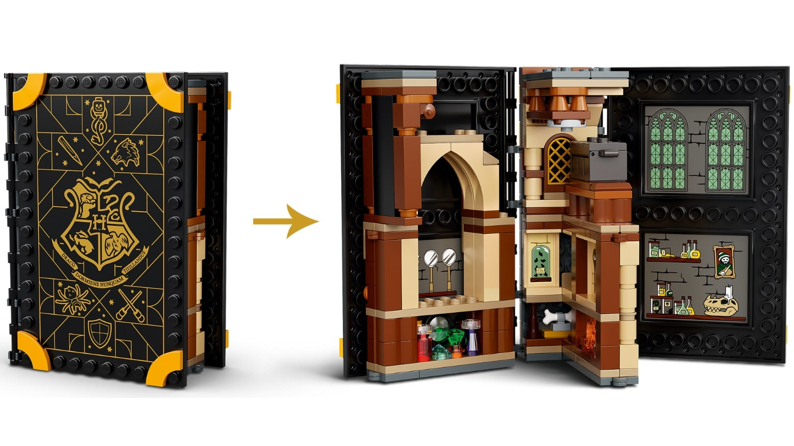Within the decorated covers is a captivating classroom full of magical adventures. There are 3 minifigures – Mad-Eye Moody, Hermione Granger™ and Neville Longbottom™ – plus lots of amazing accessories. Some elements are built in, such as the storage shelves and fireplace, while others are detached, like the blackboard, trunk, potion bottles, desk and chairs, which lift out to create an extended play area. The set connects with others in the collection and packs away into the closed playbook, so kids can carry it wherever they go and store it on a shelf until the next class.